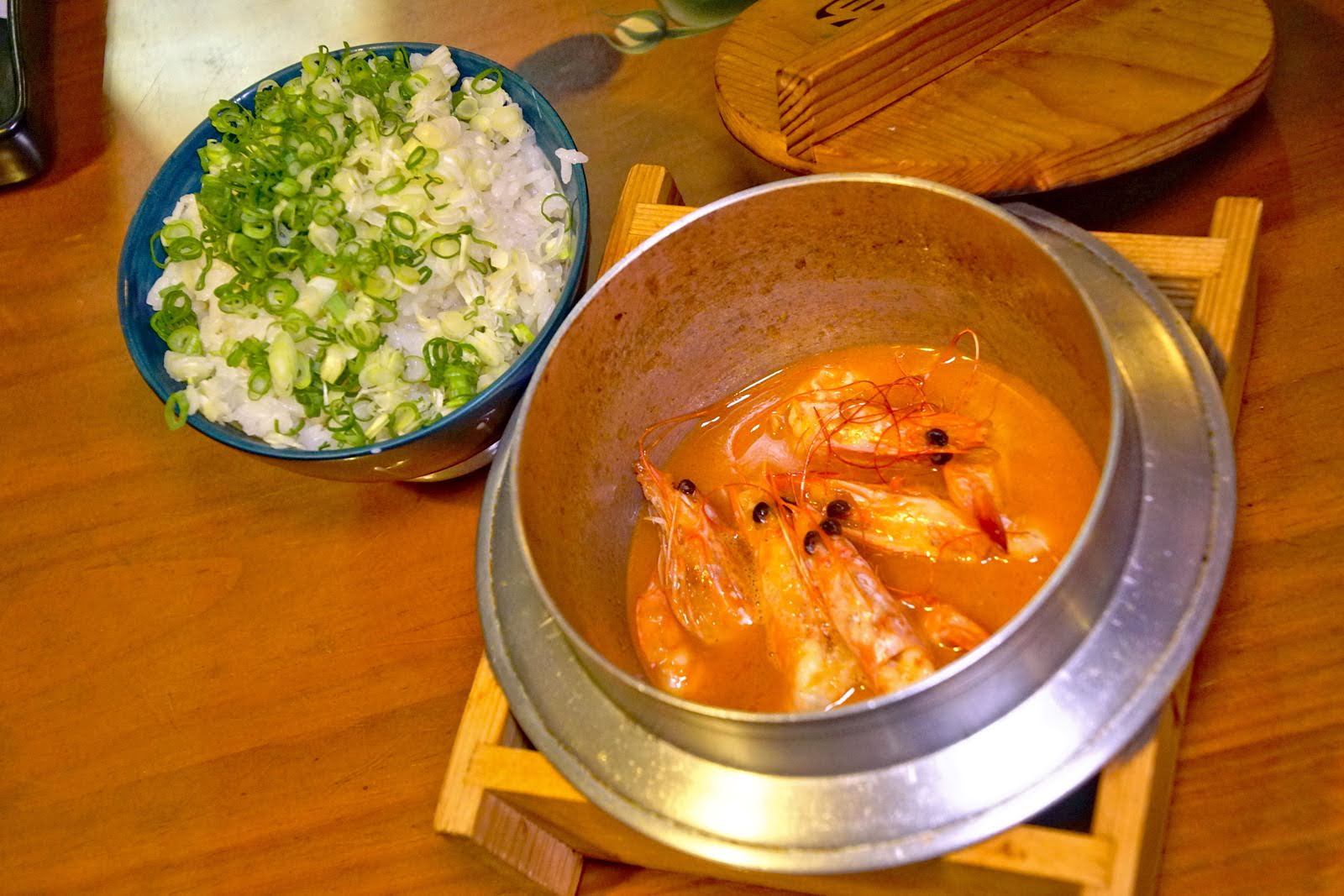 釜燒蒜香鮮蝦丼 NT. 220,看起來像鍋燒意麵的容器,還附了一碗蔥花+白飯,上桌時還搞不太清楚是什麼餐點