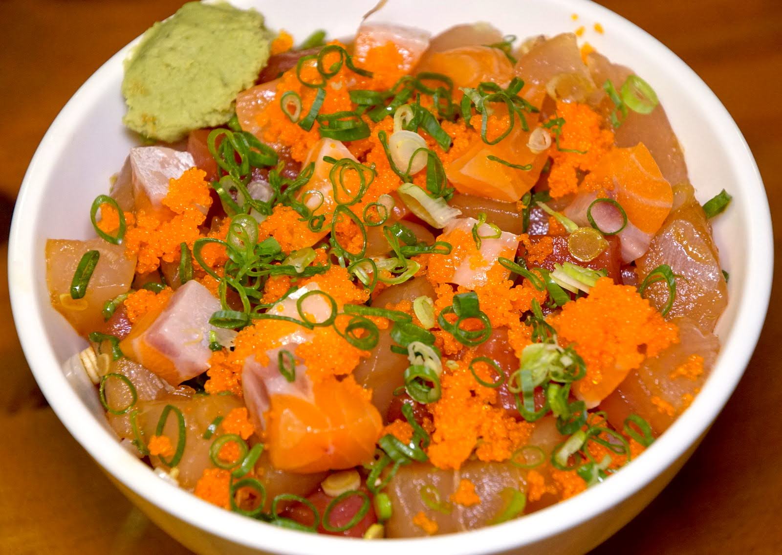 塔塔生魚散壽司 NT. 190,在壽司飯上放了滿滿地小塊的鮭魚、鮪魚、旗魚,再撒上大量蝦卵以及青蔥。因為切得比較碎,所以每一口都可以吃到魚肉,適合喜歡小口小口品嘗的人