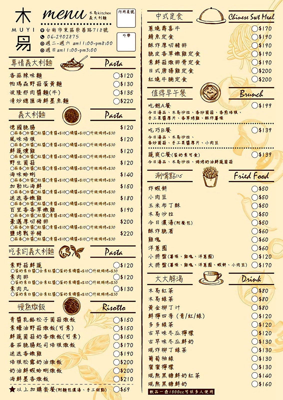 菜單,有專情義大利麵、義大利麵、吃素的義大利麵、慢熟燉飯、中式定食、值得早午餐、刷嘴點心以及大大解渴。其中,義大利麵是以主菜做區分,然後可以選擇蒜香、白醬、紅醬、青醬、橘醬或升級焗烤;而專情義大利麵則是正如其名:單一口味,無法做醬汁的變化。另外,每道餐點都有附飲料,+NT. 69元可以升級套餐,會多了手工麵包、濃湯以及手工甜點