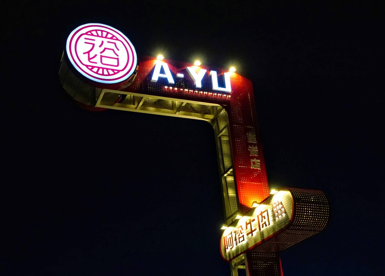阿裕崑崙店佔地超過千坪,整體裝潢以白色為主,新店LOGO設計為金色的牛頭,高檔的外觀設計讓人聯想到台南美術館二館的感覺。