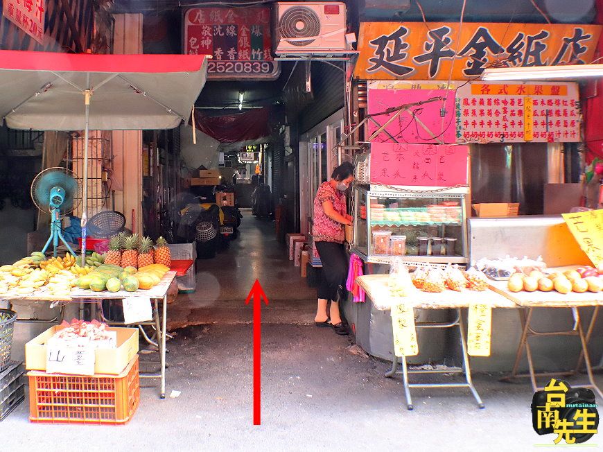 巷子口是一間金紙店跟水果攤,直走進去7秒鐘就會找到麵包店(照片箭頭處)