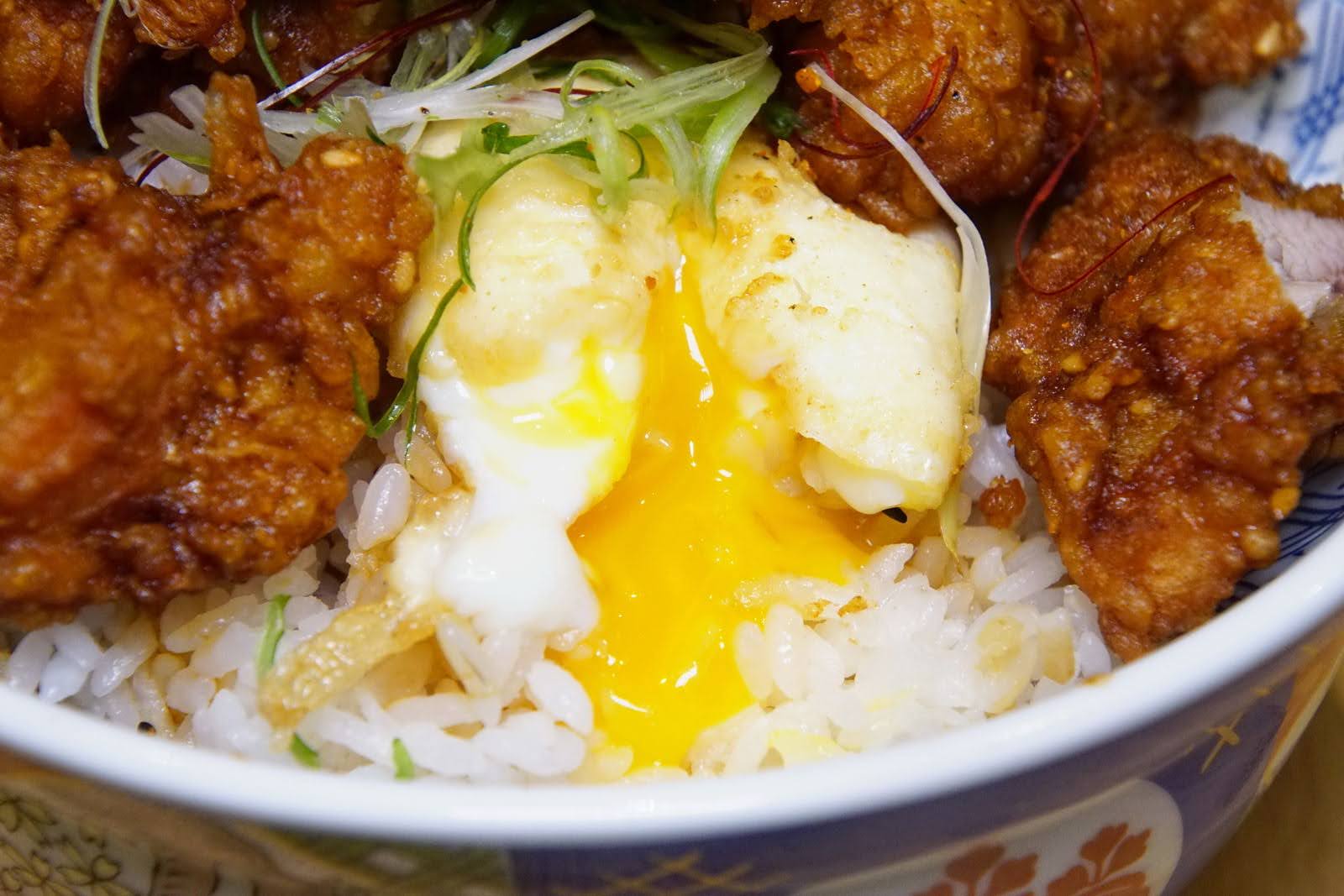 丼飯內有一顆炸半熟蛋,依照慣例要來一下破蛋秀
