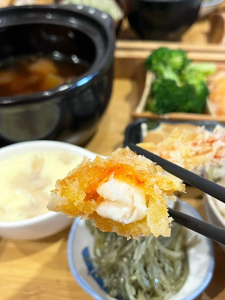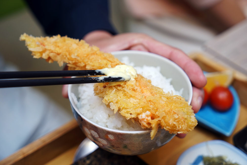 ▼一口咬下,發現店家的炸蝦是整隻完整蝦子,保留頭與尾的蝦殼,去掉中間身體蝦殼,吃起來帶脆又嫩,越嚼越有香氣,而且店家使用新鮮蝦肉,很扎實又鮮嫩。