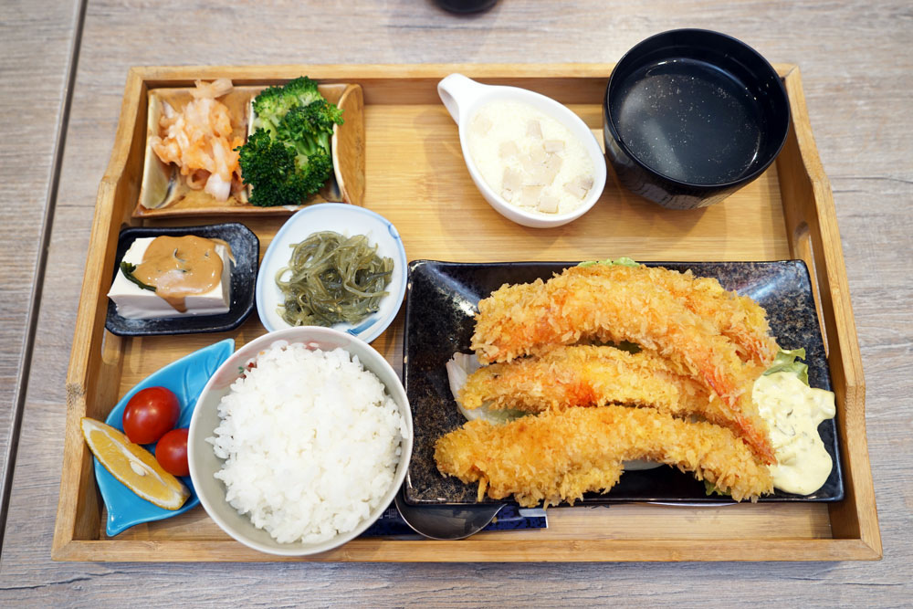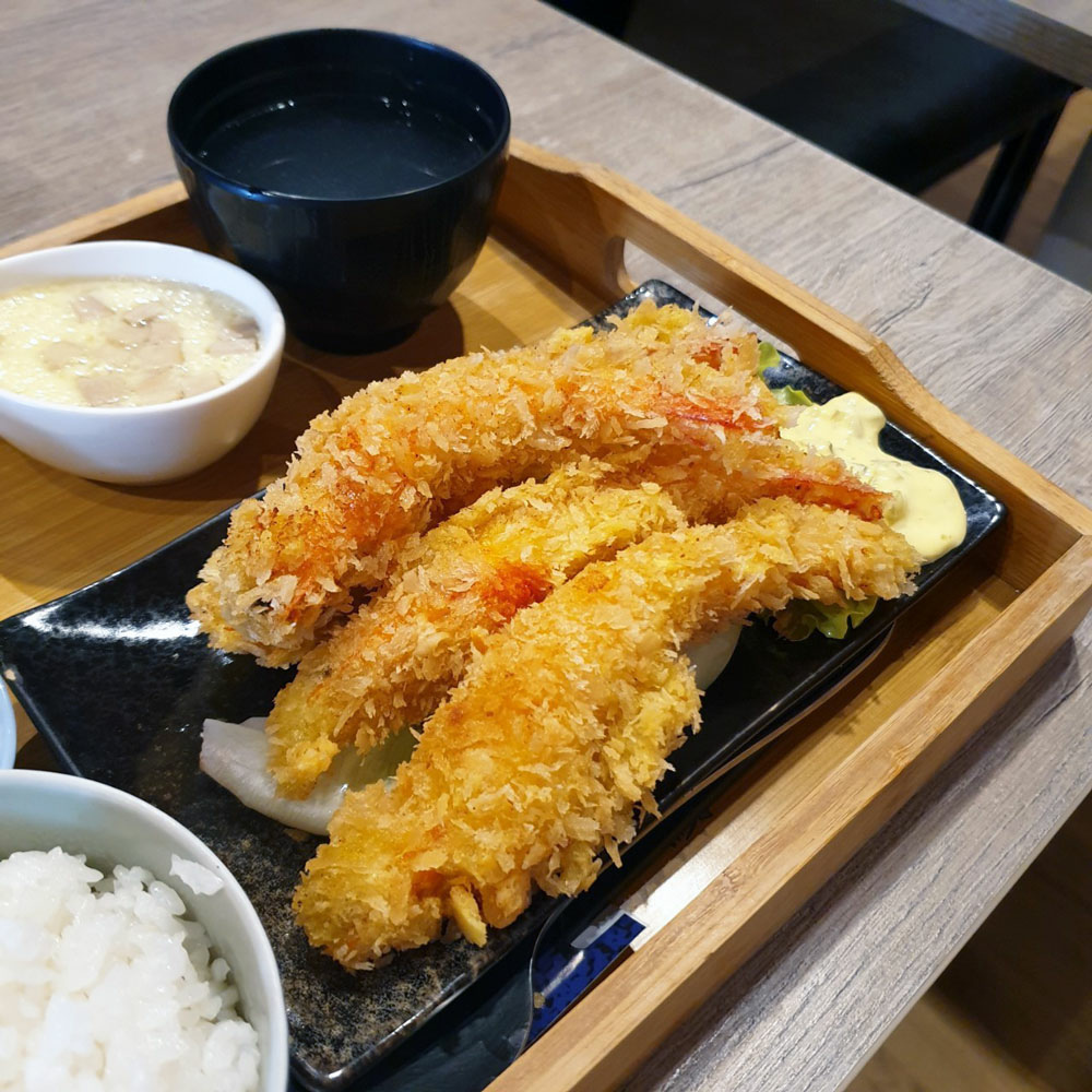 ▼四隻大蝦扎扎實實躺在盤子上,外表炸得金黃香酥。