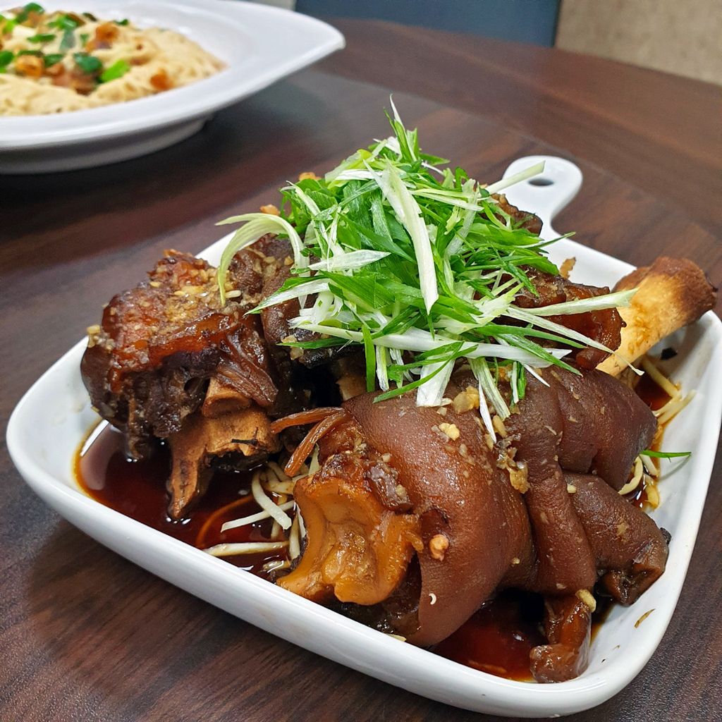 用中藥材、滷汁熬煮至少一小時的滷羊腳,羊腳的皮吃起來軟糯又Q彈,羊筋燉到很軟,上面撒上蒜頭末,和滷汁很對味,而且雖然醬汁色深,但是吃起來不重口。