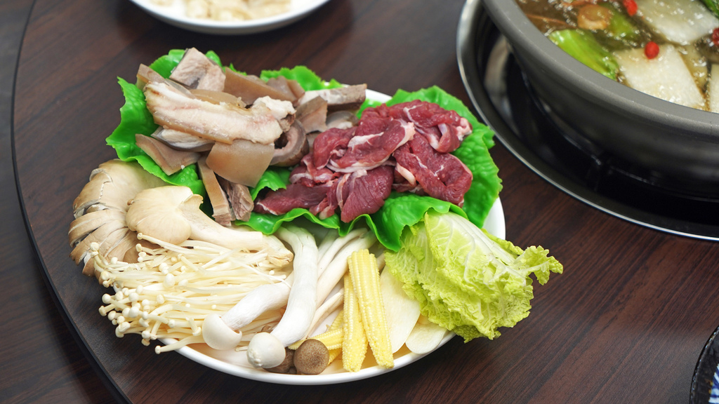 有溫體鮮羊肉切片、帶皮羊肉、鮮菇、鮮蔬。
