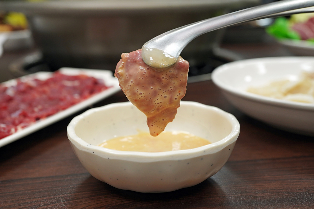 ▼ 沾點豆乳醬,鹹香的味道帶點很淡的辣,果然和羊肉很對味。