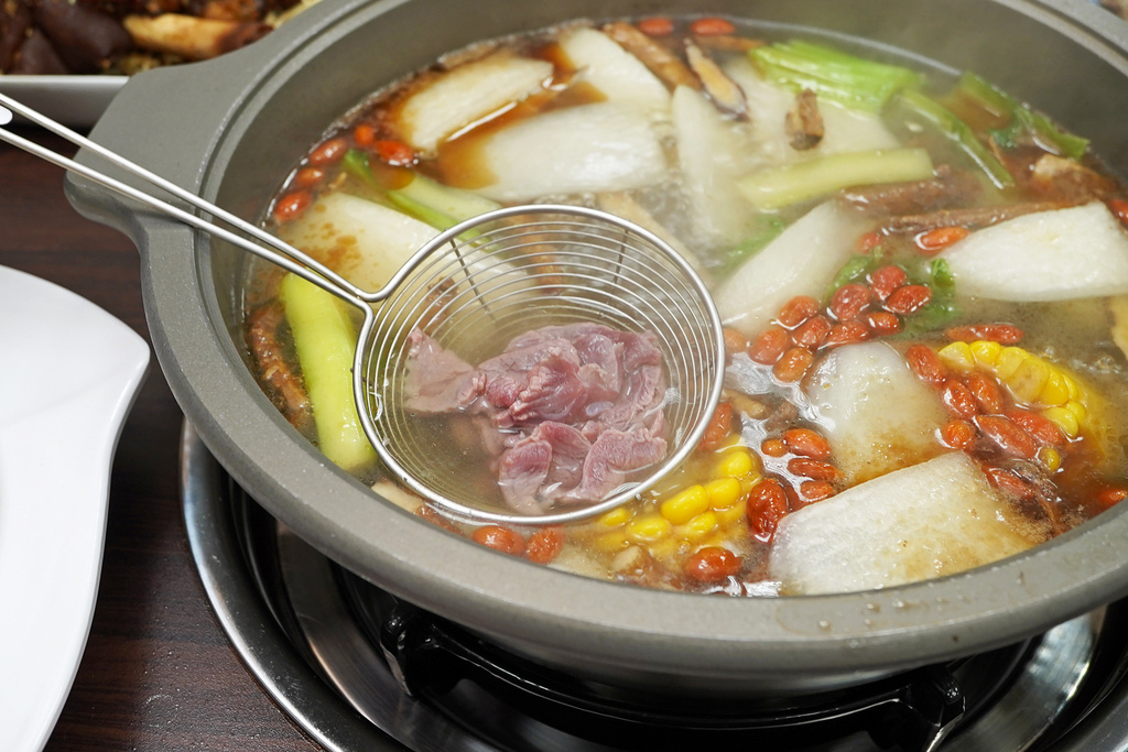 這家的藥膳羊肉爐也跟傳統的很不一樣耶,店家說是以芥菜心、芥菜、大量當季蔬菜和羊骨熬製的湯頭為基底,再加入五種中藥材:枸杞、黃耆、川恭、黨參、當歸尾(比當歸頭、身的香味更濃)下去熬煮,然後用大量的麻油和薑片、少許米酒,我覺得比起傳統藥膳,這鍋有蔬菜的甘甜、中藥的材香、麻油的香氣,味道層次更豐富,而且湯頭的味道不會很厚重,越喝越覺得清爽順口。