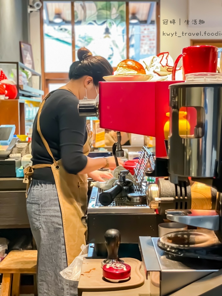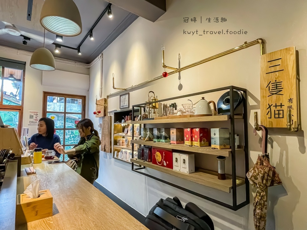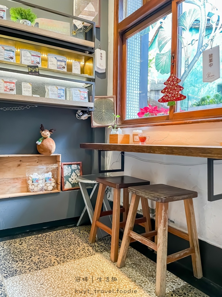 完美使用了老宅內不大的空間,在牆面上掛上展售架,整齊地陳列著台灣茶葉、莊園咖啡豆、咖啡用具、手作甜點等奇暖咖啡自製商品。