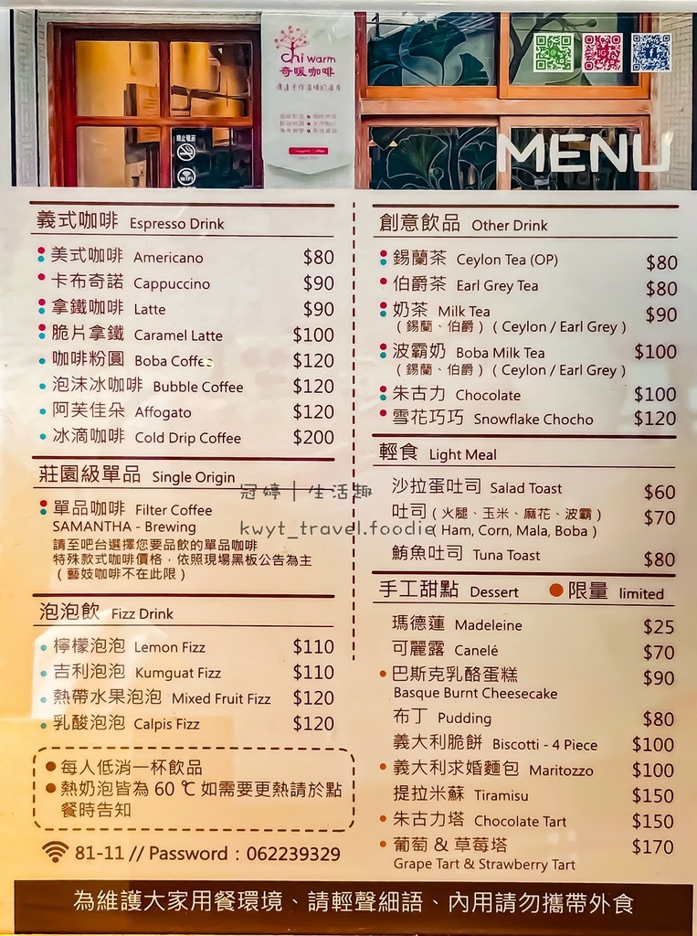 本文同步發表於:【奇暖咖啡】中西區咖啡廳推薦,蝸牛巷內的隱藏版老宅咖啡,手工甜點Ft.精品手沖│菜單