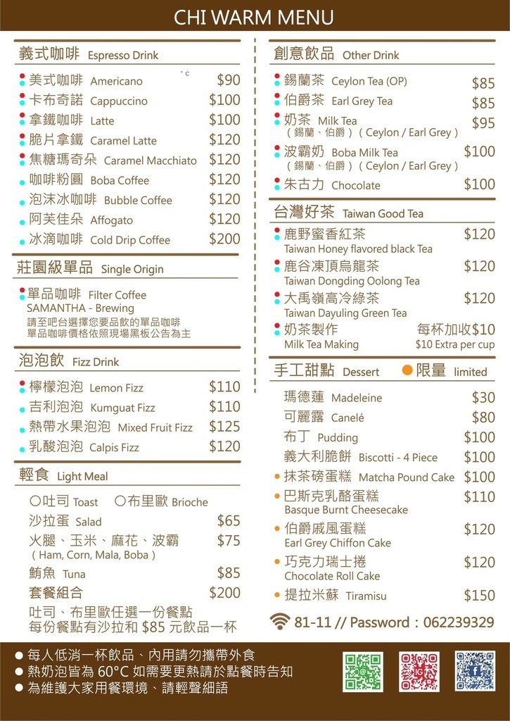 奇暖咖啡菜單 (來源:奇暖咖啡FB粉絲頁,2022.06)