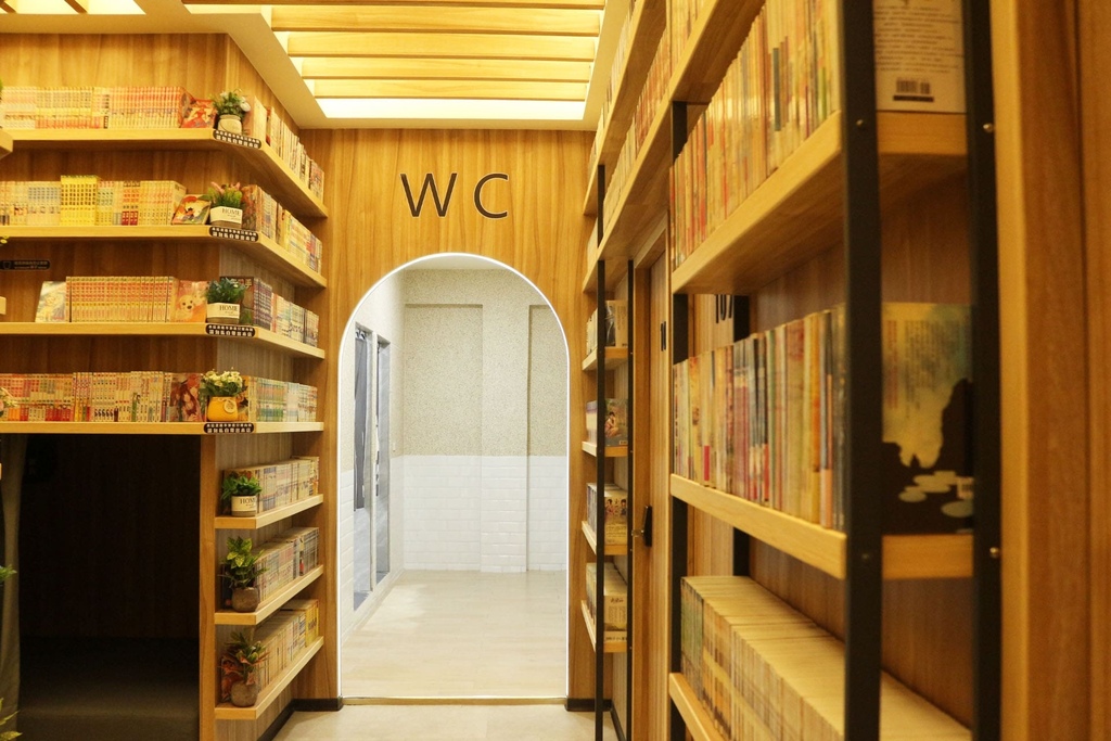 不只有上下舖包廂,獨立包廂也融合於書架之中,並有標示房號