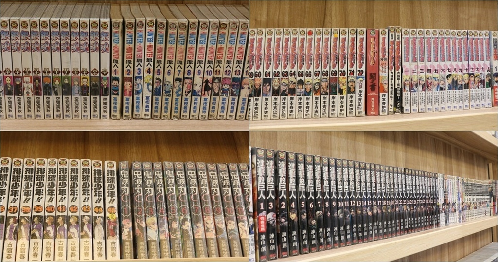 這層書架上主要有進擊的巨人、鬼滅之刃、排球少年、火影忍者.......等王道漫畫