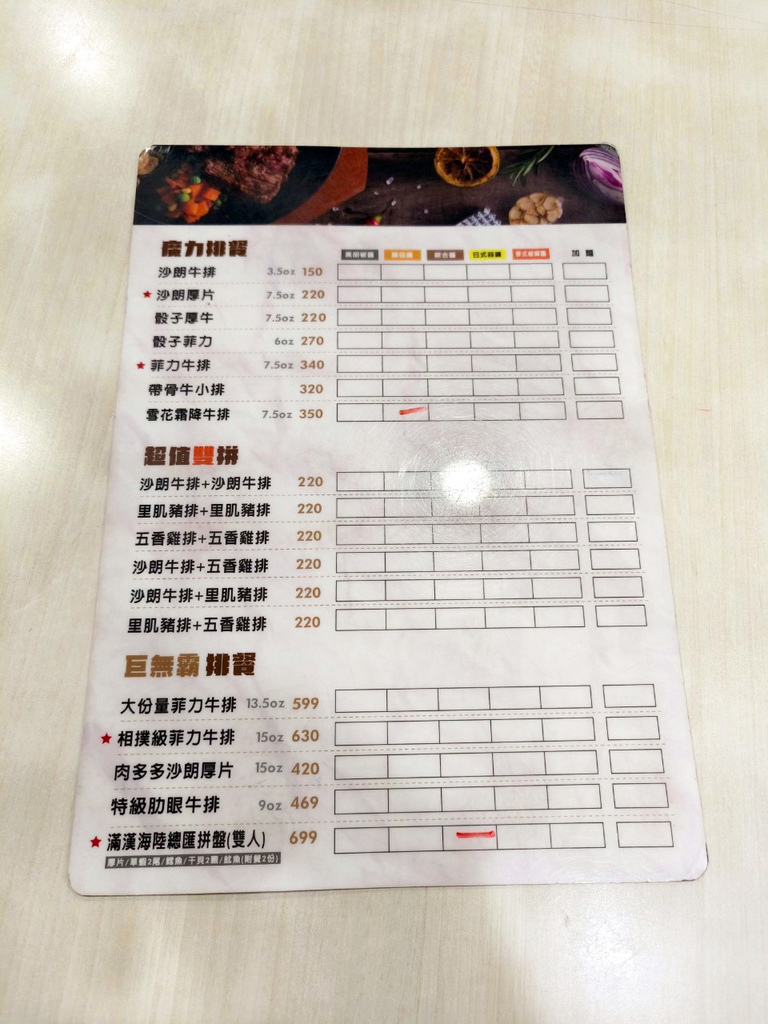 魔力排餐(牛排)、超值雙拼(牛雞豬任意搭配)、巨無霸排餐、不吃牛系列(雞豬海鮮)、單點小食
