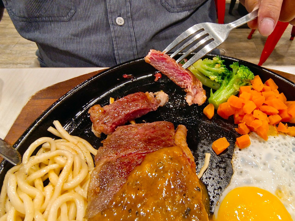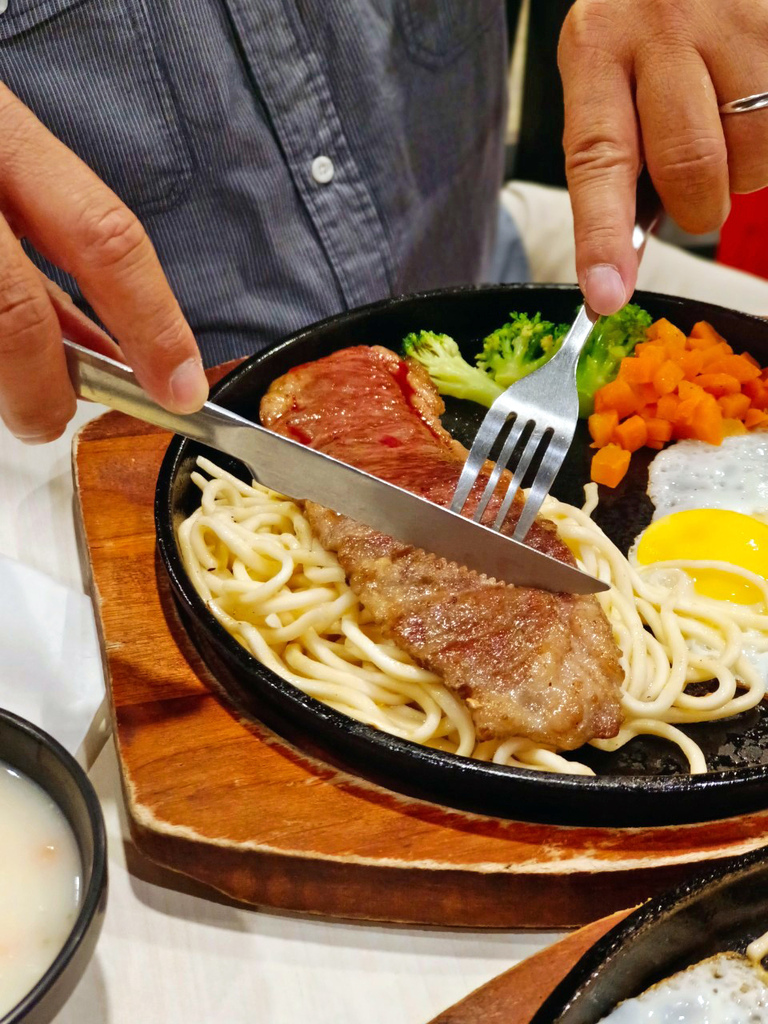 ▼鐵板上的牛排散發誘人的牛脂香氣,讓我心急拿起刀叉準備切下去