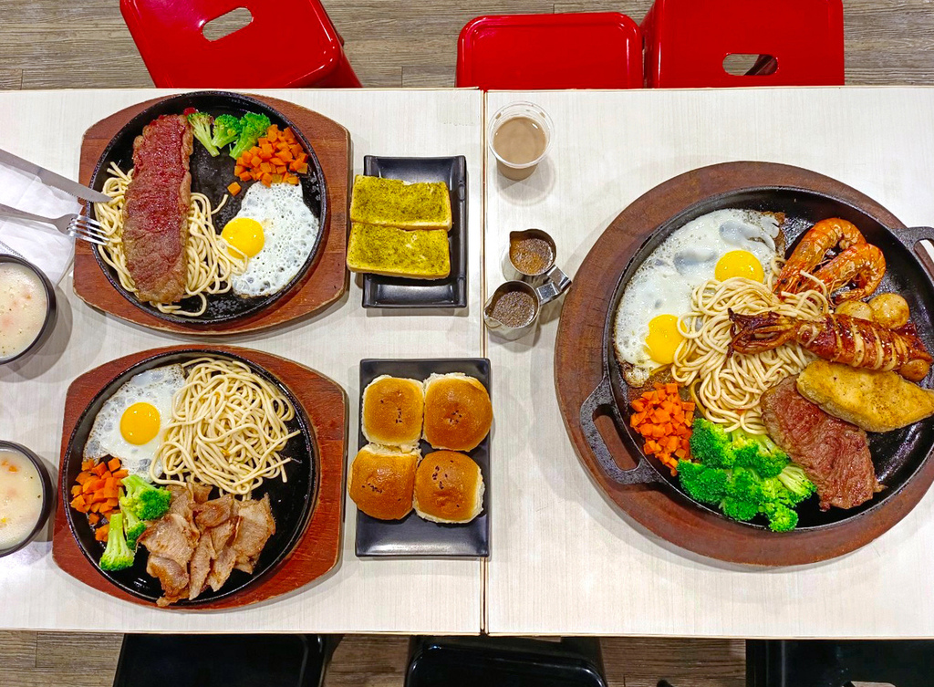 我們一行人共點:雪花霜降牛排、松阪豬排、滿漢海陸總匯拼盤(雙人)、單點香蒜麵包