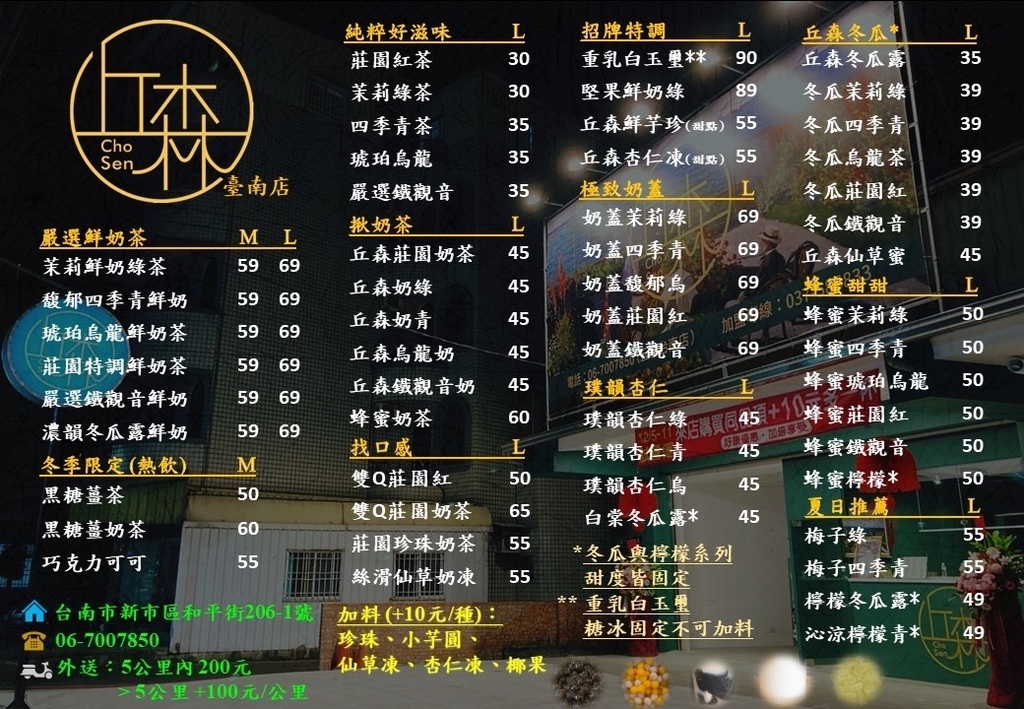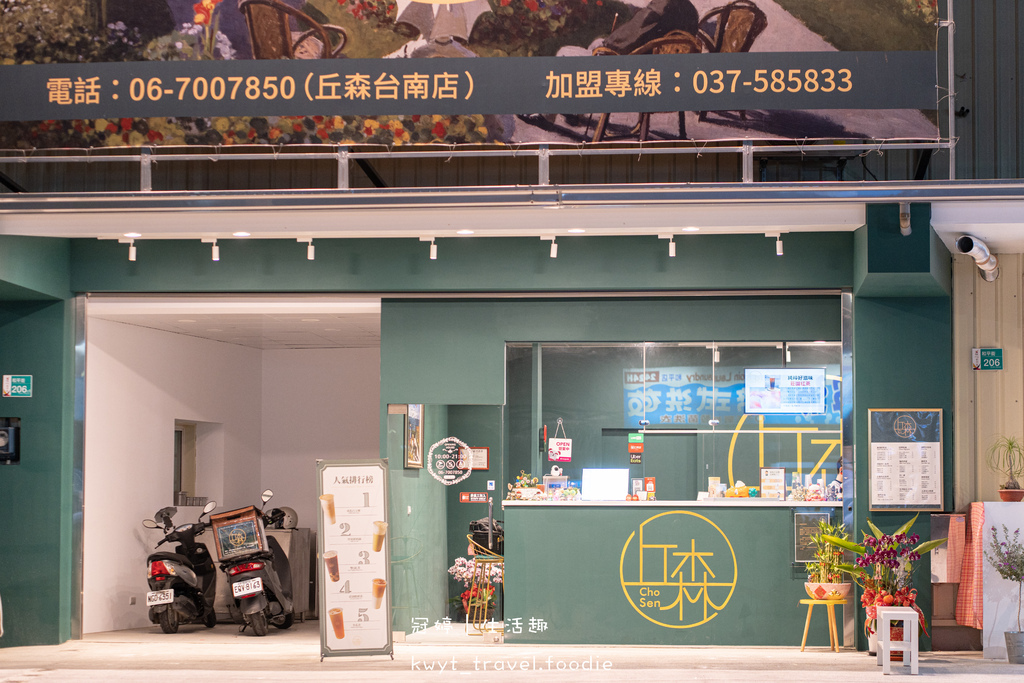 丘森茶室台南店位於台南市新市區和平街206-1號,主打手作芝士奶蓋,店門口有相當大的空間可暫時停放機車、汽車,騎車、開車前往買飲料不用煩惱沒地方停車蠻方便的。