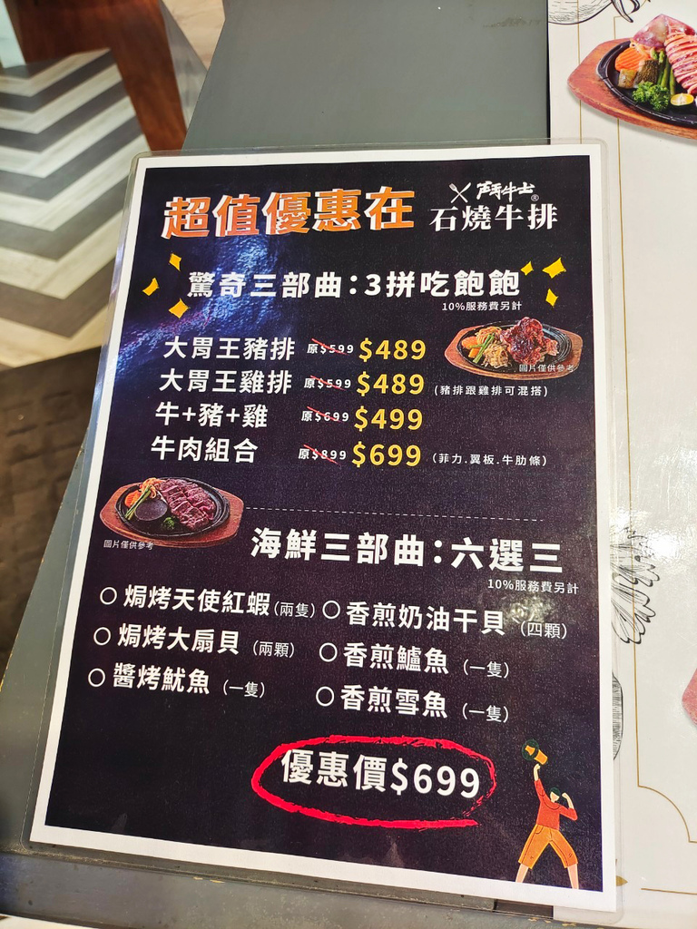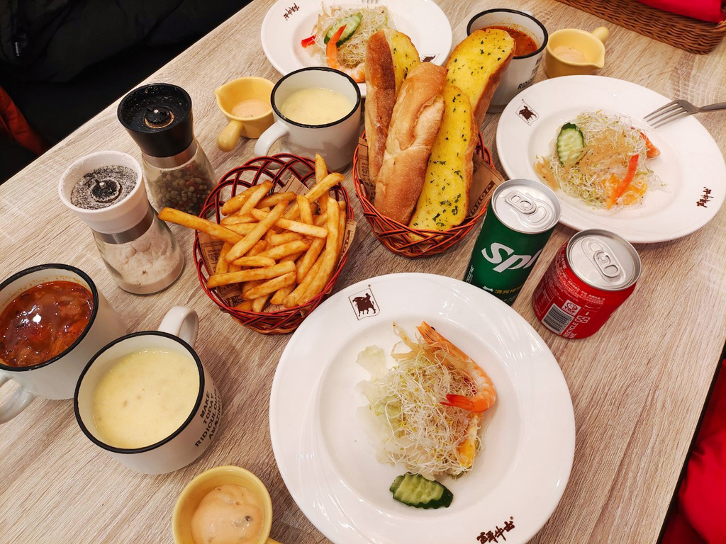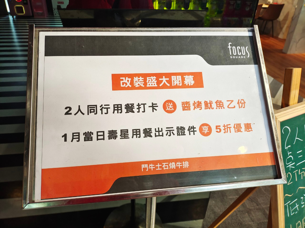 剛好focus美食餐廳超多,我們逛到鬥牛士石燒牛排,發現它全新改裝開幕,用餐空間更加寬敞,菜單好像也有變動,餐點有附蒜包/薯條/沙拉,還有湯品/飲料/冰淇淋吃到飽,感覺很不錯就決定吃這家!