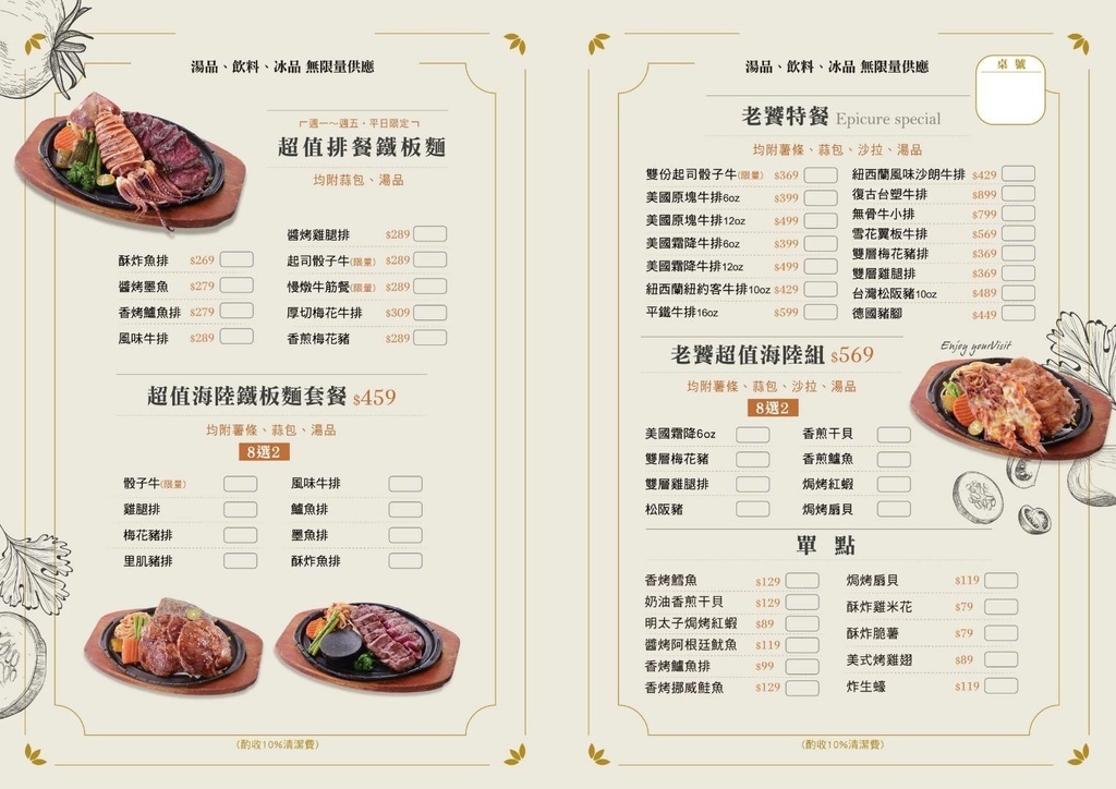 超值排餐鐵板麵:最低$269起,平日限定,均附蒜包、湯品