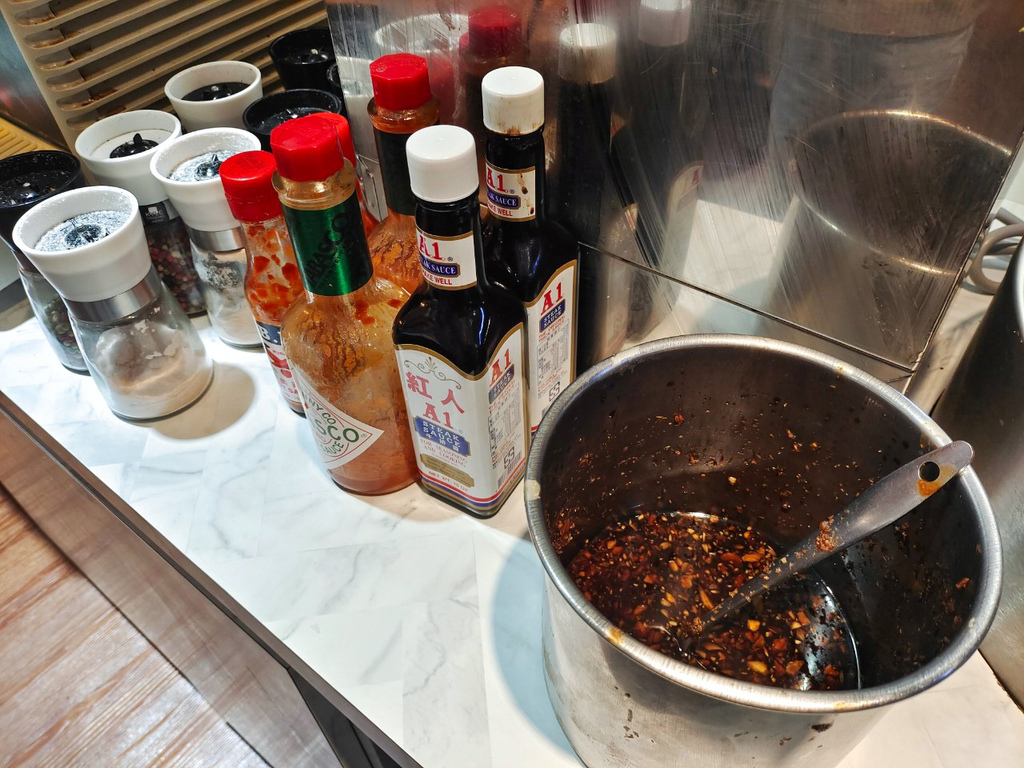 右邊是鬥牛士石燒牛排獨家自製的蒜蓉醬油,店員說改裝前都是熟客要才會給,因為要的人太多幹脆直接擺出來讓大家自取
