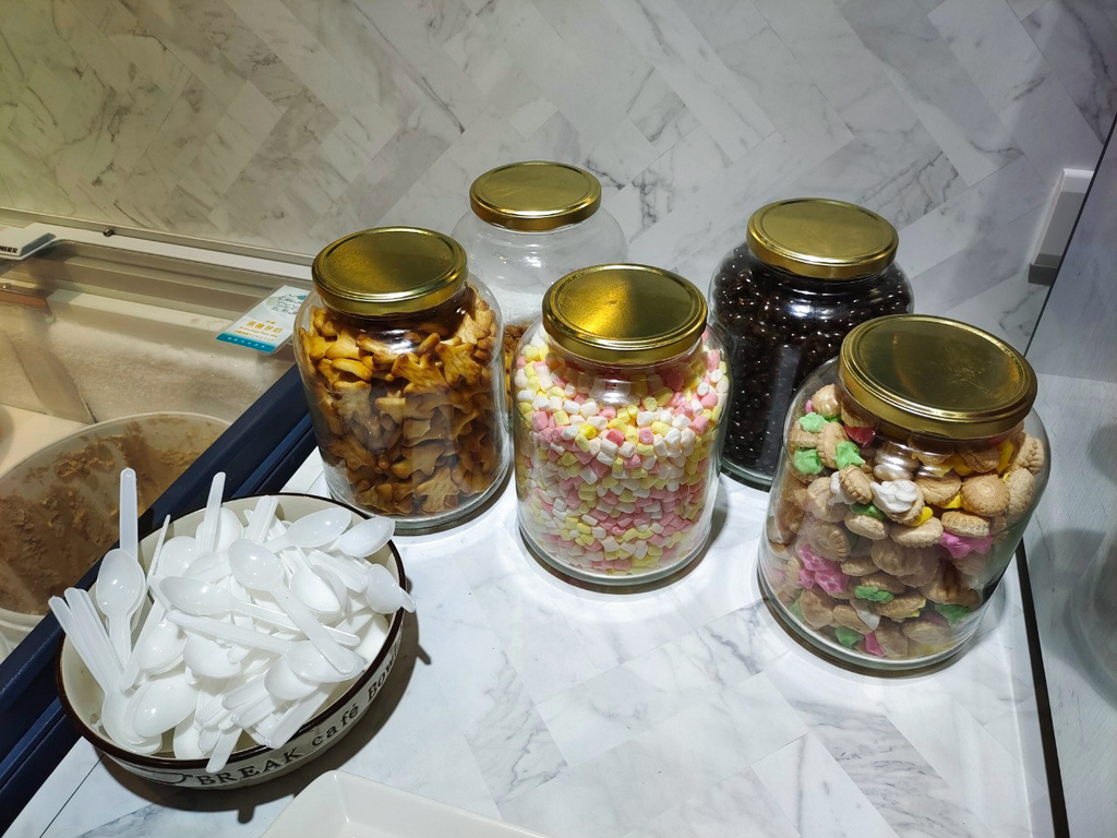 ▼冰櫃旁邊還有飛機餅乾、棉花糖、巧克力球等等小點心可以加到冰淇淋,如果帶小孩來很吵還可以用這個安撫他們!哈哈計畫通