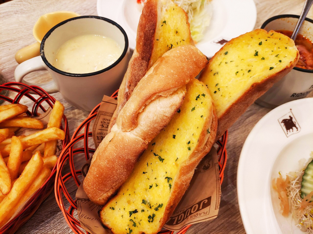 點完餐,店員很快送上蒜包、薯條、沙拉,讓我們可以墊墊胃