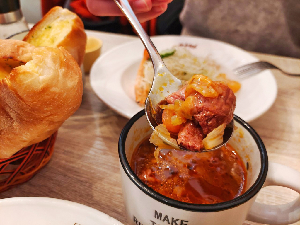 ▼義式羅宋湯裡面好多料,隨便撈都是滿滿的牛肉塊和蔬菜,這在外面可能都要賣100、150元,這裡直接喝到爽也太佛了吧