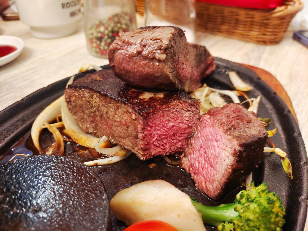 ▼切開剖面還帶粉紅肉色,吃起來比霜降牛肉更扎實,喜歡稍帶嚼勁的牛排可以點這道