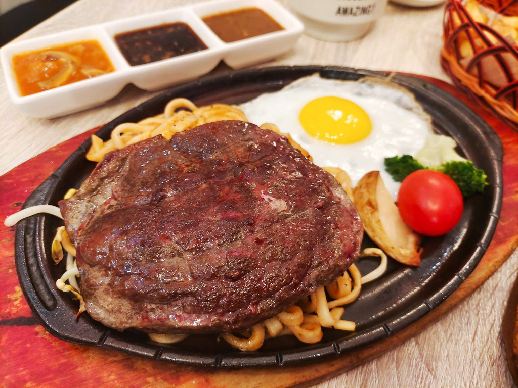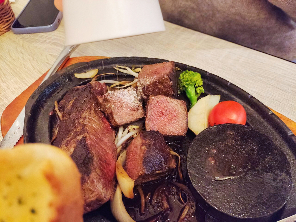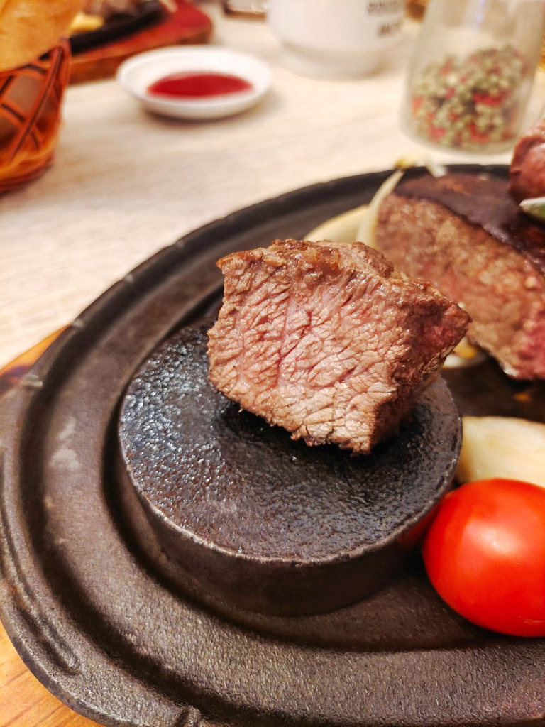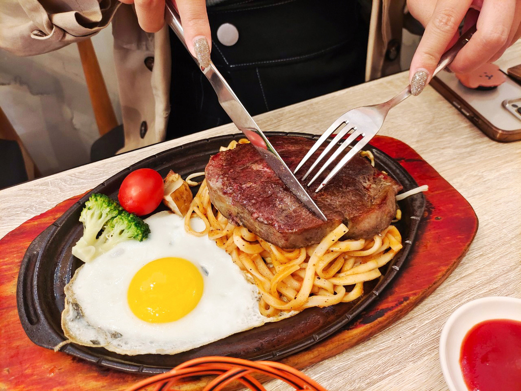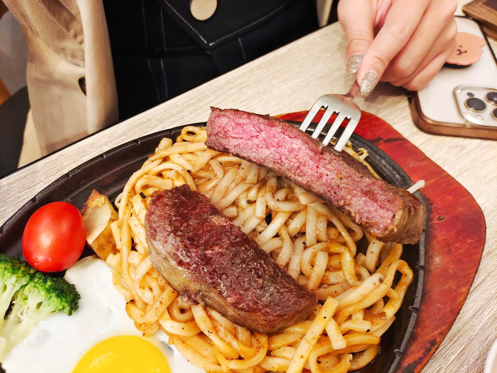 ▼霜降牛排厚實多汁,咀嚼起來非常軟嫩,每一口都充滿甜美的牛肉汁液