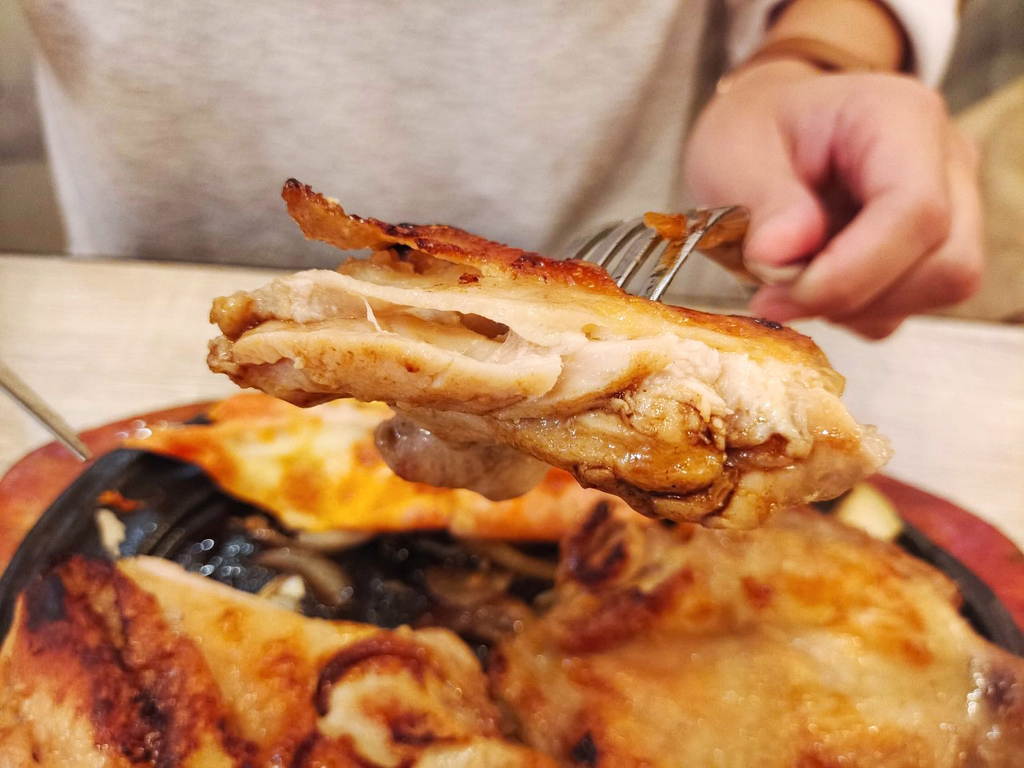 ▼側面切開也是有厚度,還會溢出肉汁,吃起來肉質鮮嫩無比、雞皮酥脆,果然牛排館的雞腿排都不會讓人失望