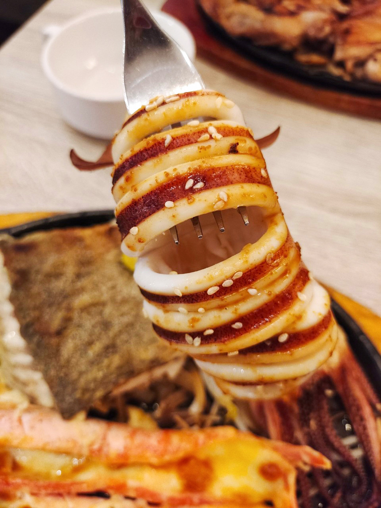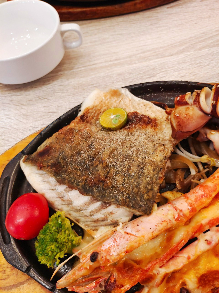 海鮮三部曲:焗烤天使紅蝦+醬烤魷魚+香煎鱸魚