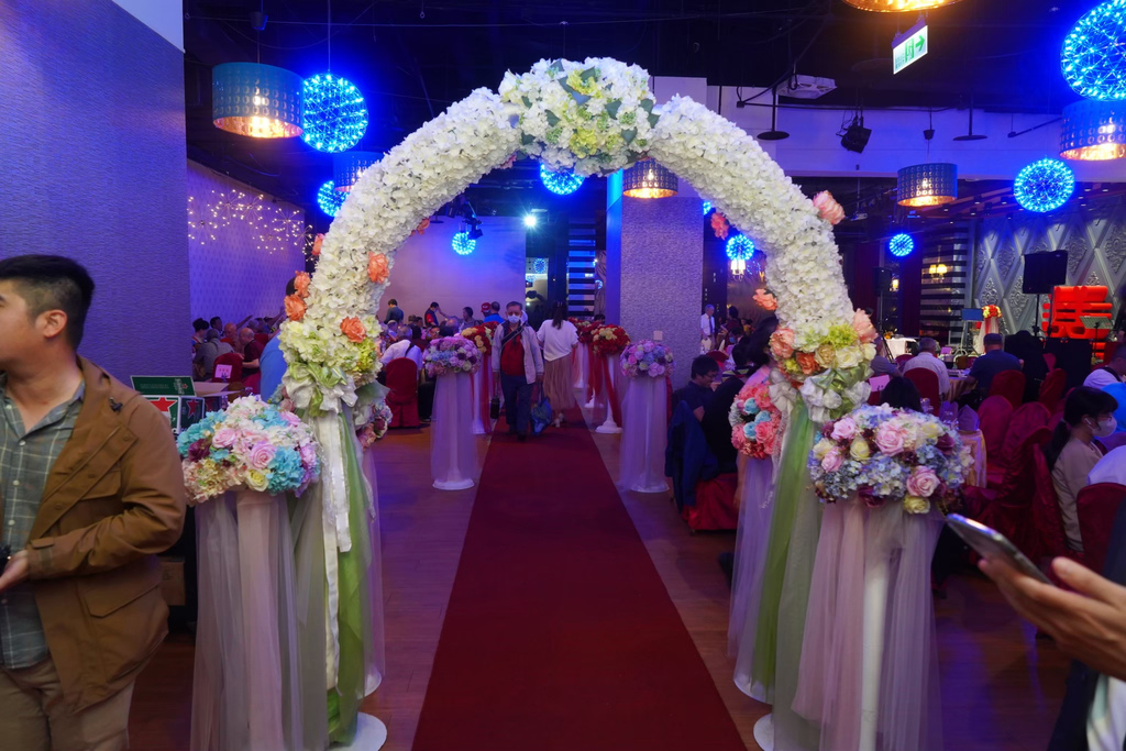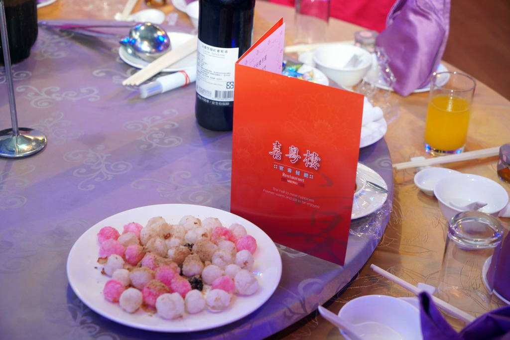 後來詢問了一下櫃檯,喜粵樓宴會餐廳其實環境可以做多種變化,能夠容納大型婚宴,也能提供小區域舉辦,並提供多樣化的菜單選擇。菜單基本上也都客製化規劃,甚至不管是親友唱歌,新人想要玩什麼把戲!(我看過很誇張的)他們原則上都可以配合。