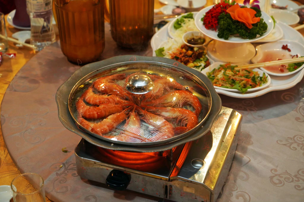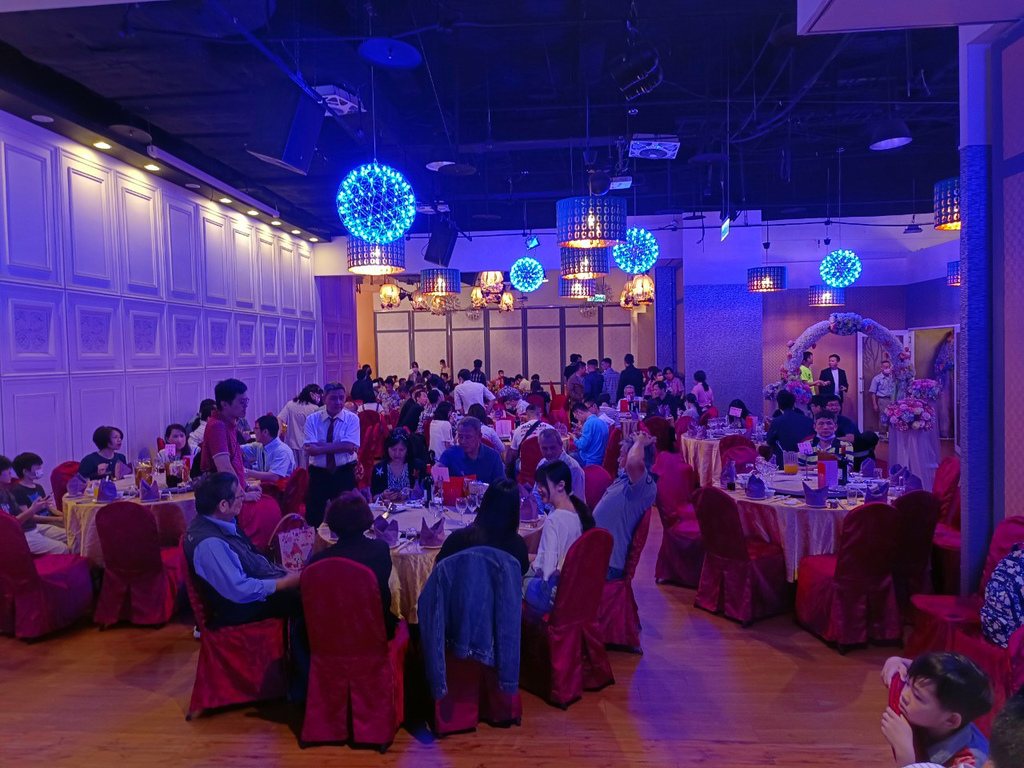 在我們吃的同時,從新郎開始,陸續上台唱歌!現場真的是蠻歡樂的!