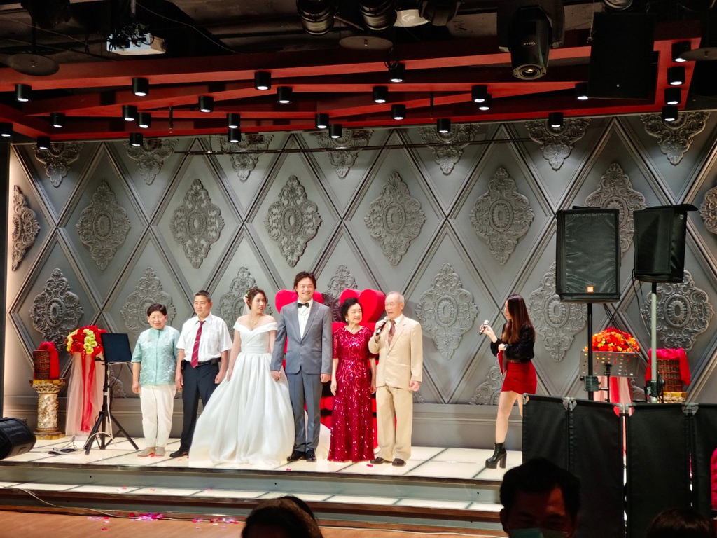 ▼新人進場完後,兩邊家長與新人一起致詞,整個舞台大小剛剛好!而且幾乎沒有高低落差,長輩上下超安全。這點真的蠻不錯的,因為我們看過很多都還要走一個階梯,對於長輩很不友善。舞台前方也跟用餐桌隔出一個區塊,不管在出入上,或是想跳舞,其實都很理想。