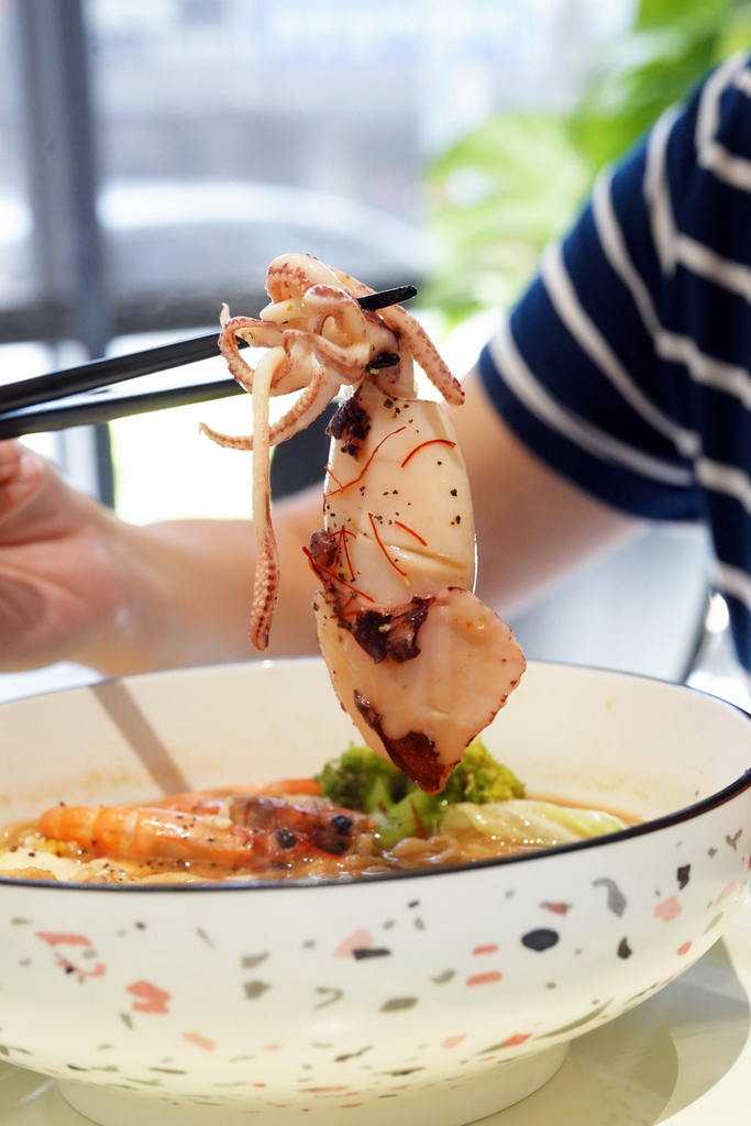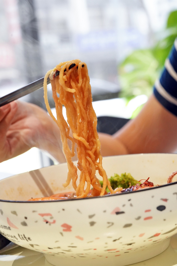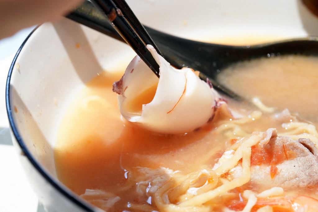 ▼意麵是細長飽滿的那種麵體,蛋香味誘人,在湯頭裡面浸泡也不會軟爛油膩,吸附湯汁一大口吸進去,滿滿的一口吃起來很過癮!
