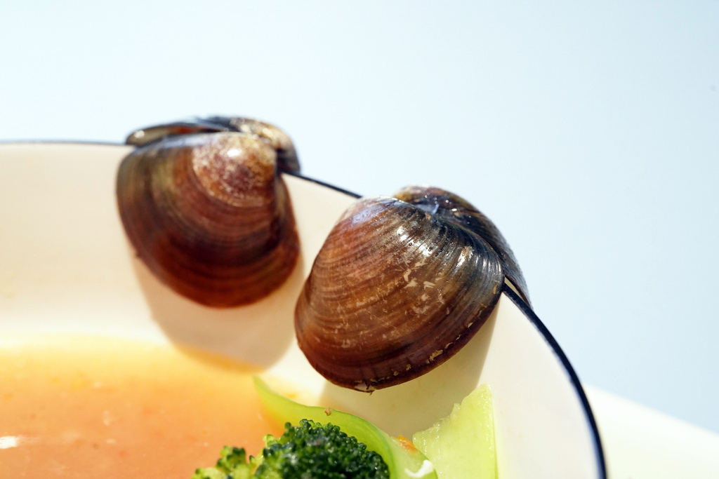 ▼吃完的殼掛在碗緣上,莫名的可愛,有沒有像小響板!
