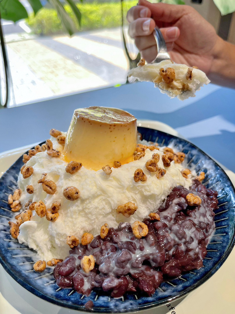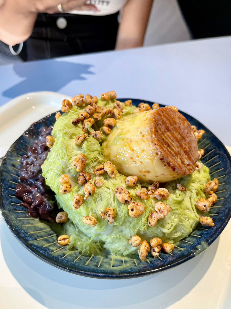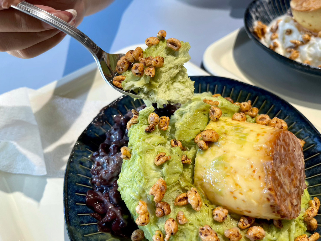 ▼淡淡的抹茶雪花冰,搭配綿密紅豆、軟綿綿的雞蛋布丁、以及像米香的甜麥仁,整體是符合台灣人口味的日式風味~