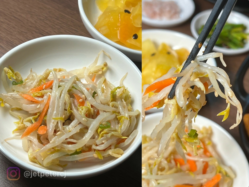爽脆的豆芽感受到麻油香味,充滿水份,可以除去炸物的油膩感,我加一點進去拳頭飯,吃起來口感更豐富~