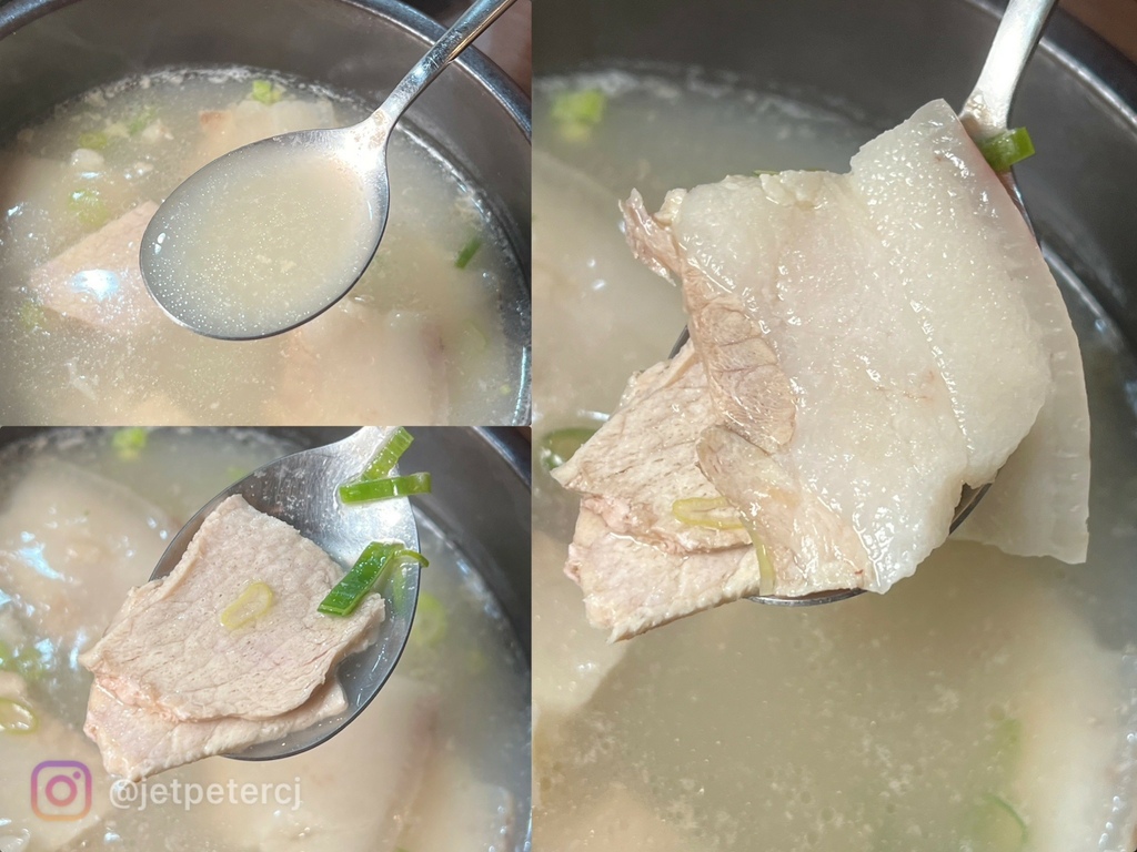 在白飯上淋上超濃豬肉湯,濕潤口感一口接一口~吃不慣湯泡飯,也可以一口白飯、再喝一口豬肉湯,絕佳的組合就算一個人用餐也超飽足~