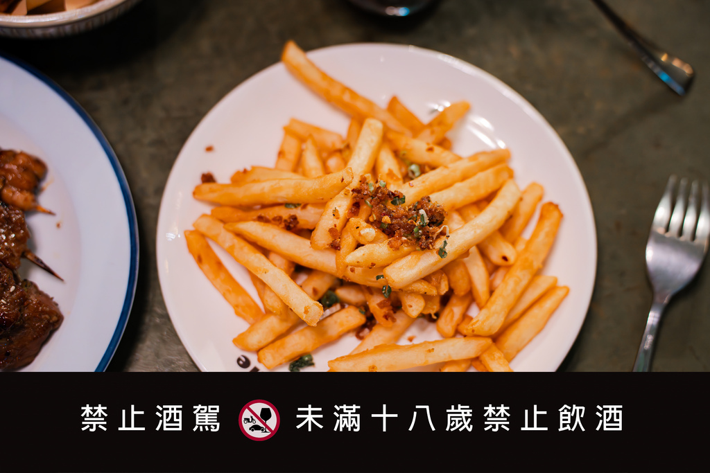 厚切馬鈴薯薯條,加入蒜香椒麻醬相拌、提香,外酥內鬆軟的口感,嘟嘟賀的鹹香、辣感,讓人一根接一根入口,很~涮嘴。