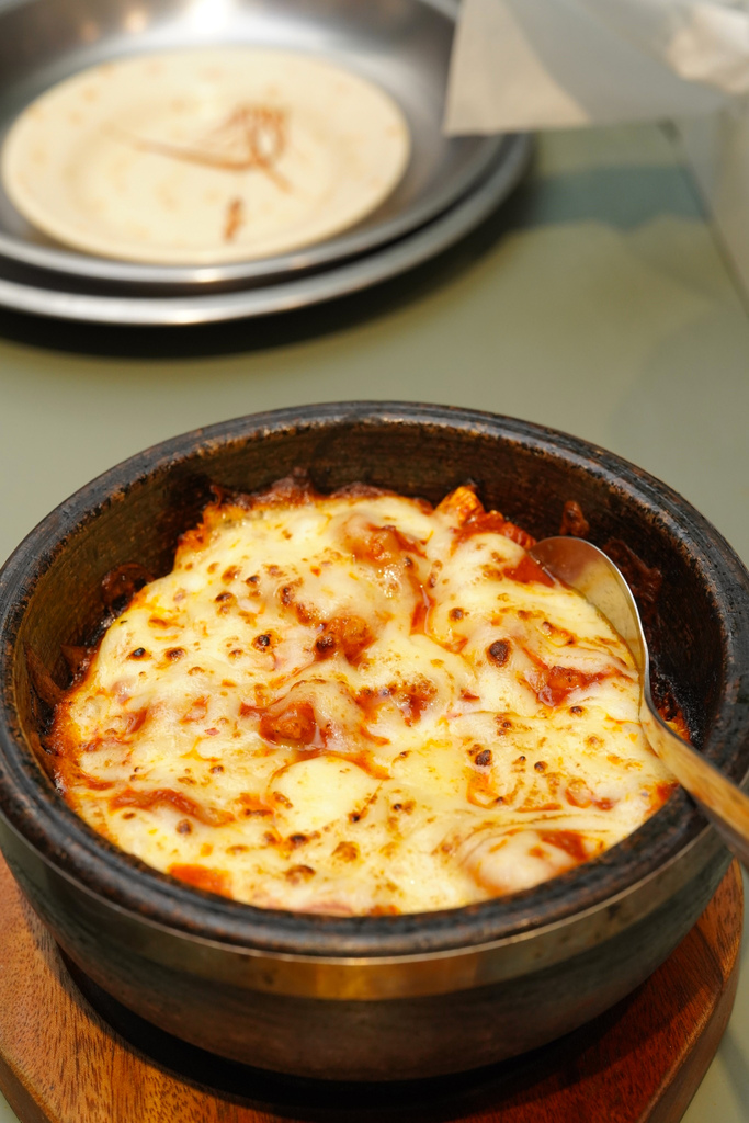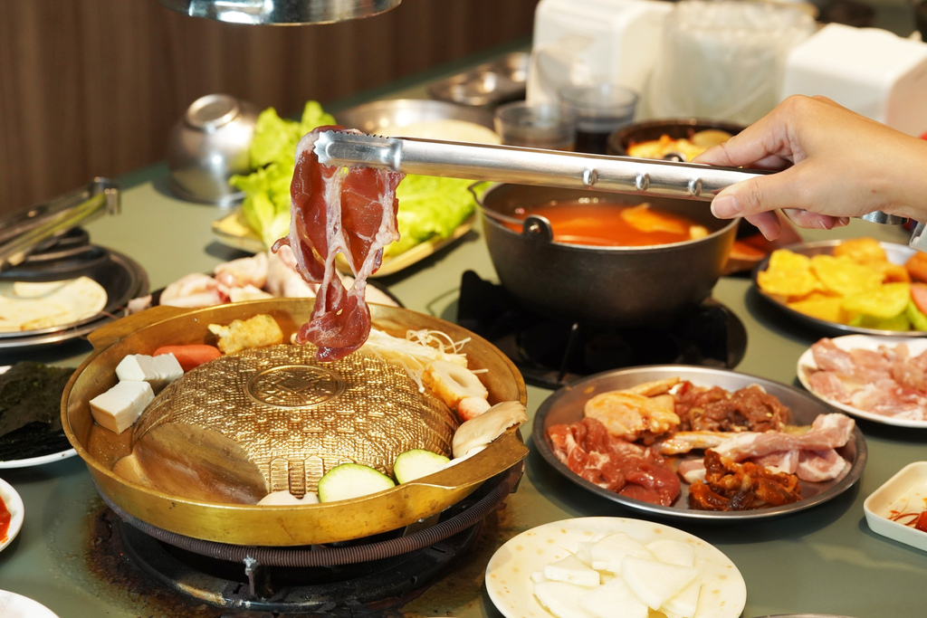 銅盤燒肉是韓國傳統的烤肉形式,中間凸外圍凹,一邊烤一邊收集肉汁湯汁,最後變成鮮美的濃郁高湯!
