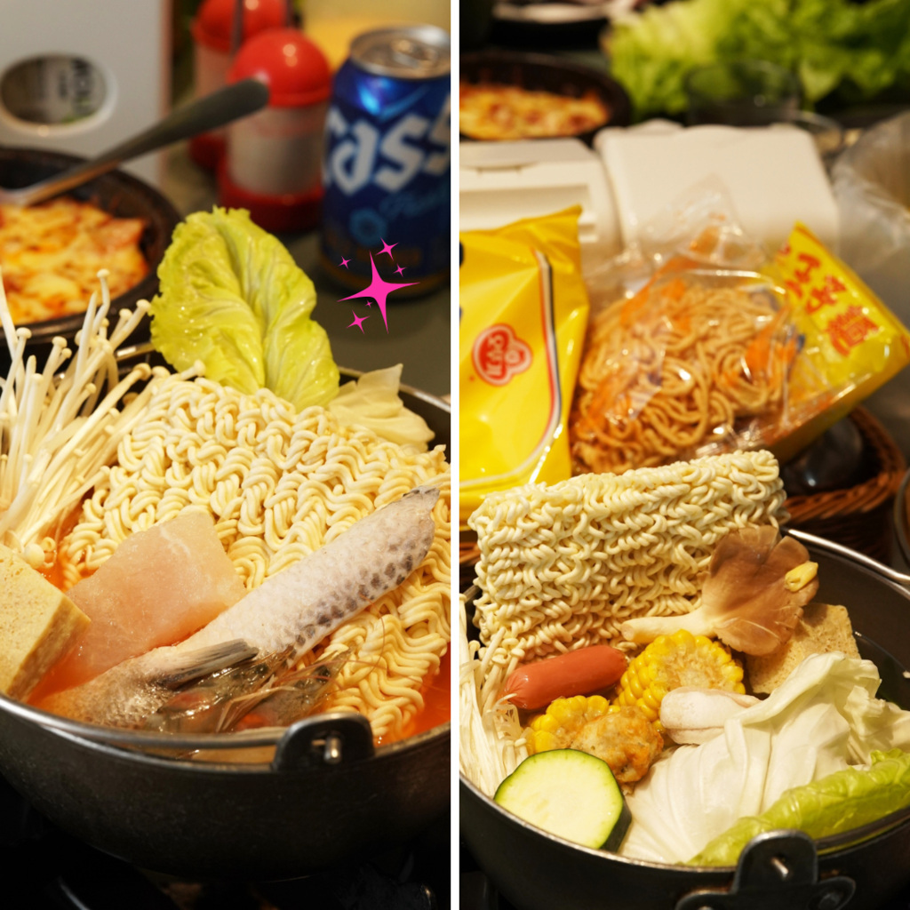 👇火鍋我們也沒有空著,王子麵、意麵,還有韓國拉麵!高麗菜、蔬菜往裡丟,火烤兩吃不要太爽🤪
