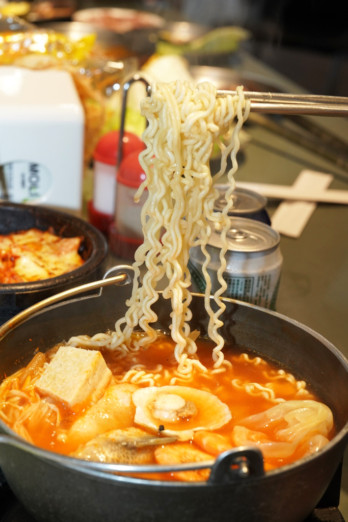 Q彈韓國拉麵,湯頭辛辣濃郁,加上海鮮提味,一碗下肚,怎麼越吃越開胃!