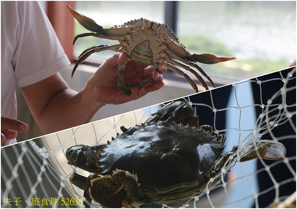 青蟹,俗名因不同性別或在不同的生命階段,有沙公、沙母、菜蟳、處女蟳等名稱。導覽老師手上這隻青蟹是母蟹,腹部的腹甲為寬錐形 (公蟹為尖錐形),且腹甲的顏色白,表示未交配過,就是市場上俗稱的處女蟳 (交配過的母青蟹,腹甲的顏色會轉為墨綠,市場稱紅蟳或沙母)。