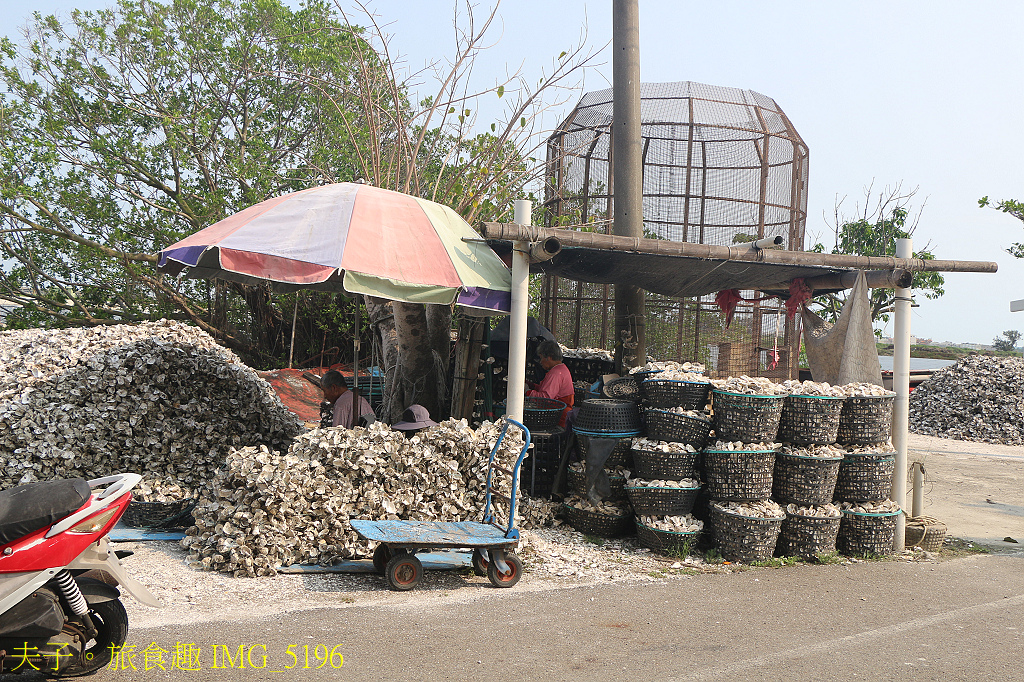 走在蘆竹溝聚落裡,道路旁處處可見堆得像小山般的牡蠣殼,蚵農手不停歇的坐在路邊用鑽孔機為蚵殼打洞、綁繩,並將成綑的蚵串疊成方塊堆放起來備用。