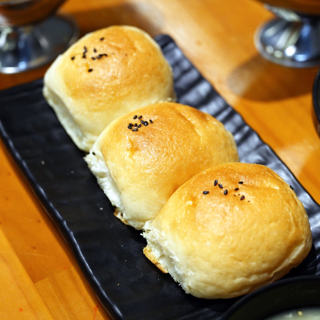 ▼排餐附的麵包是爆漿奶油餐包,因為是現烤的,熱熱吃外皮酥脆,裡面則是融化的奶油內餡,沾上濃湯也很好吃。