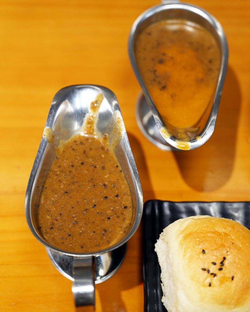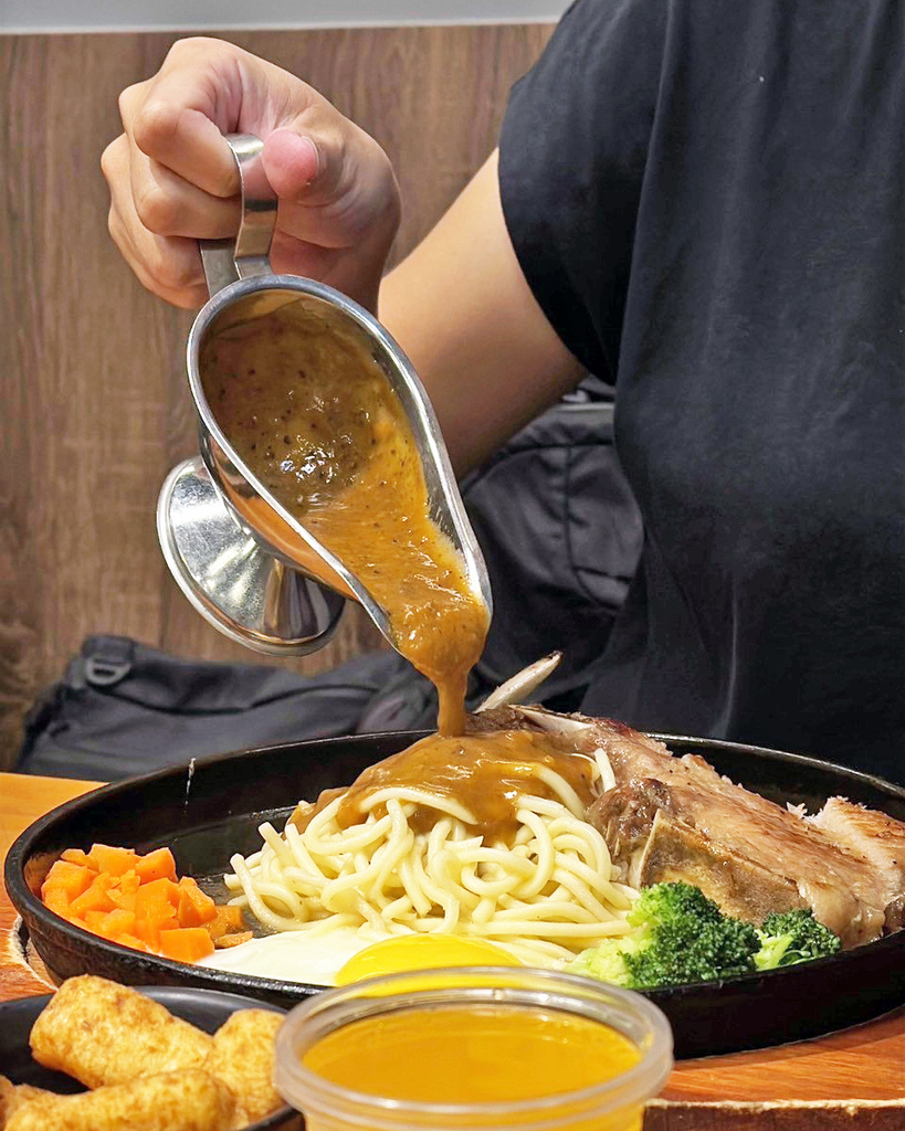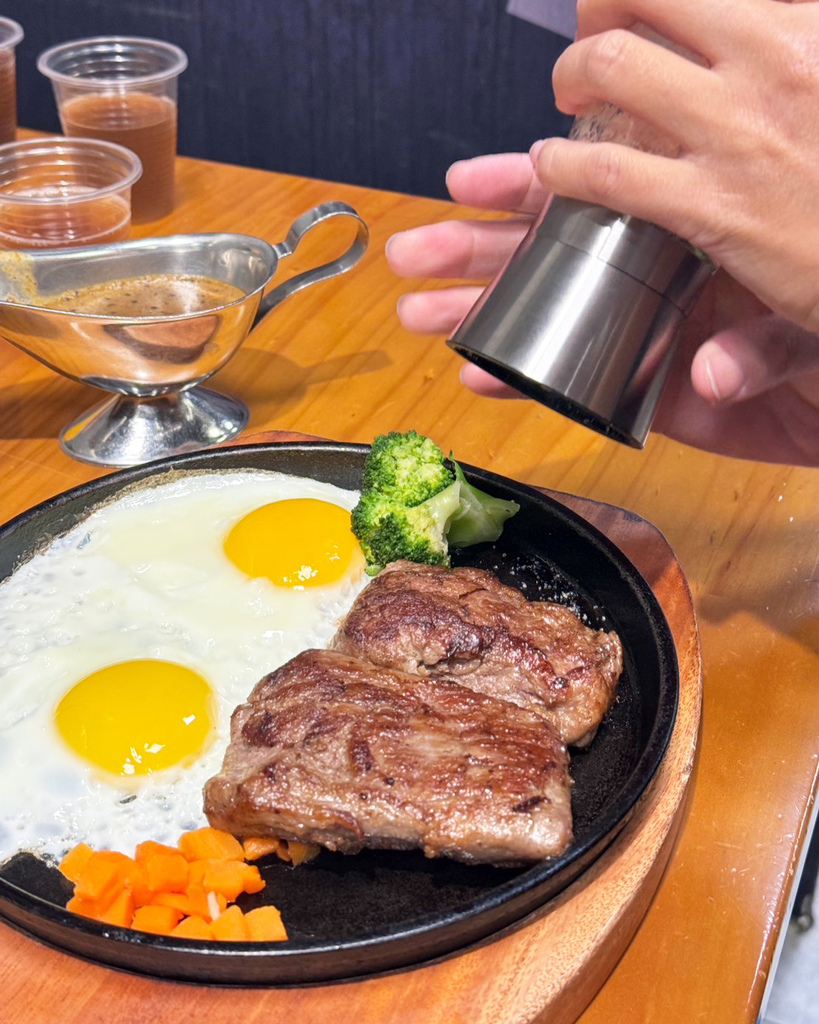 老闆說他們的肉有經過鹽巴、香料醃製,原味吃本來就有味道,加上是特別挑選過的原塊肉,希望讓大家在吃平價牛排也能享受到原塊好肉的高級感,當然想配醬汁也是可以的!