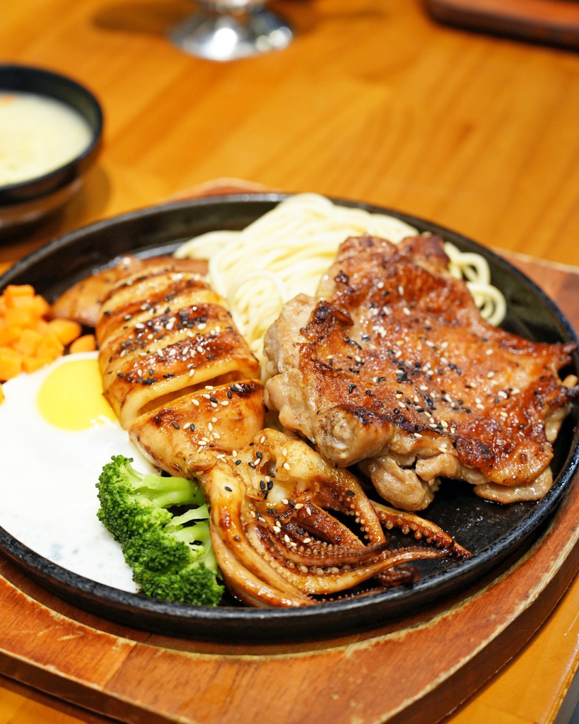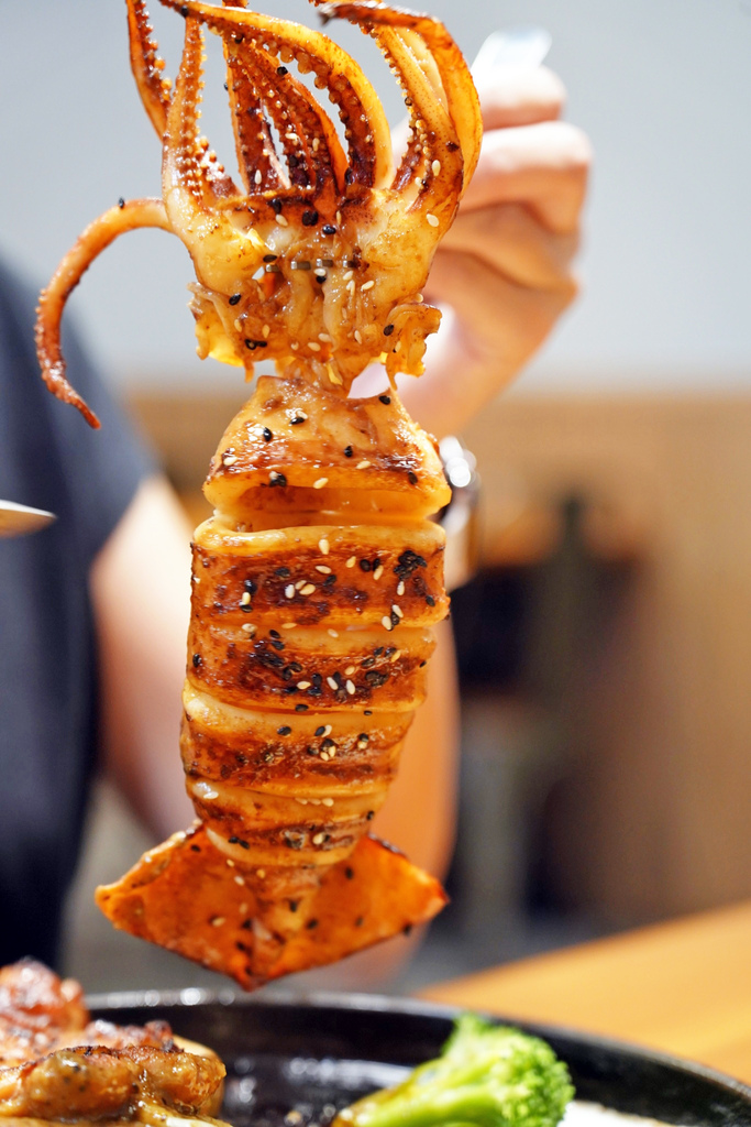 ▼香煎雞腿排是蜜汁口味,本身是有味道的了,肉質鮮嫩多汁,鹹中帶甜的滋味絕對涮嘴!煎到恰恰的雞皮上撒了黑白芝麻,香氣讓一整塊吃完也不會覺得很油膩~搭配一整隻炙燒魷魚,沒想到吃起來這麼嫩!咀嚼時還充滿魷魚鮮汁,讓我們對這隻魷魚吸引力大增!