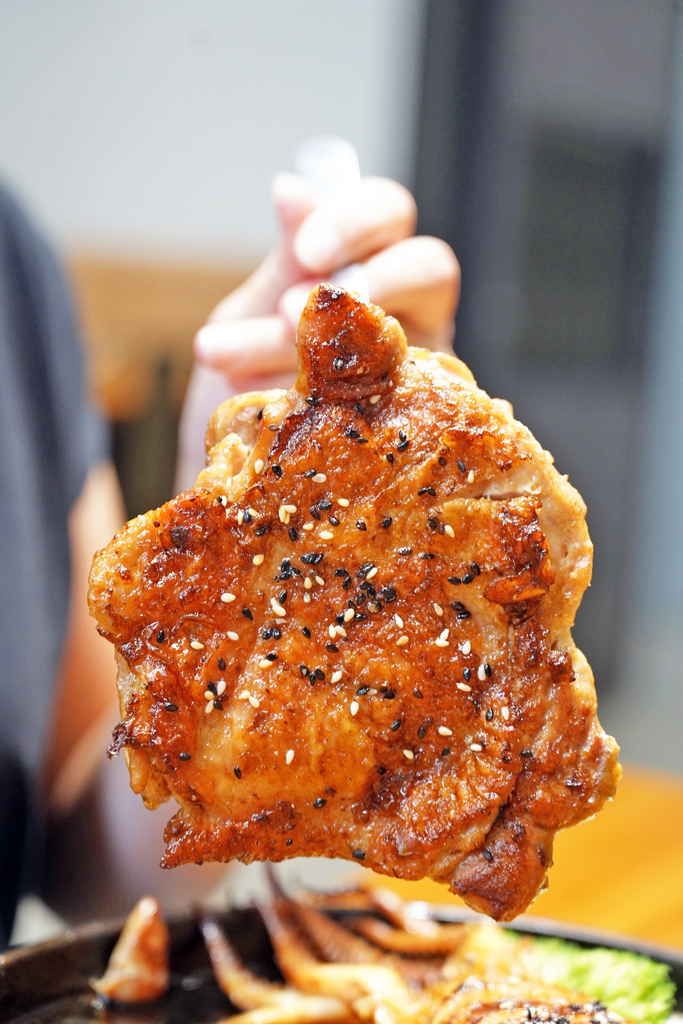 ▼用手吃最爽快~今天要拍照我姊才比較”幼秀”,不然平時早就開啃啦!厚切的戰斧豬排經過鐵板煎製後,外層油亮油香,內裡還是軟嫩肉汁豐沛~