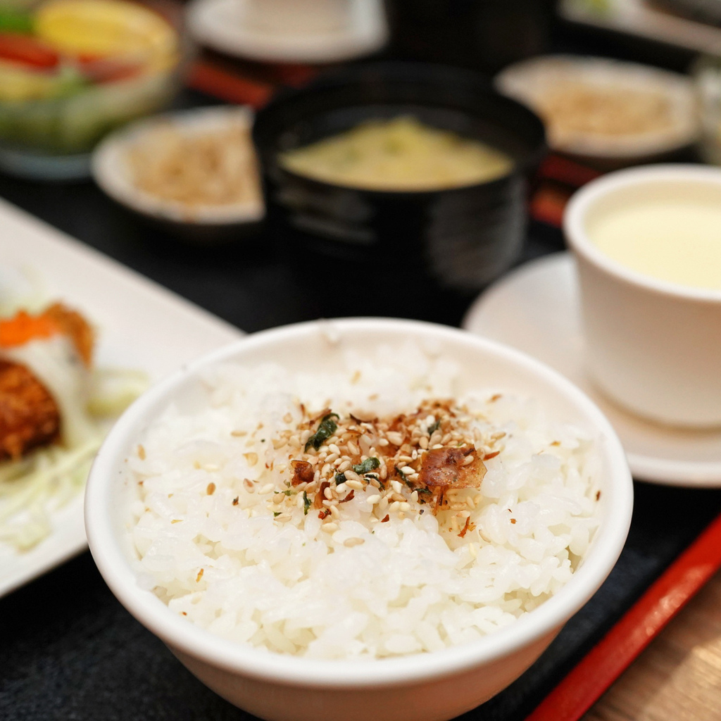▼日式定食的靈魂之一,米飯煮得粒粒分明,口感Q彈,撒上香鬆,光是配這碗飯就能扒完一整個炸物或主菜,是定食裡不可或缺的配角。